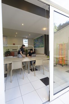 Conçue autour d’un jardin commun en cœur d’îlot avec des arbres de hautes tiges aux couleurs vert-rosé, des parasols métalliques mais aussi des banquettes colorées, la résidence est aménagée pour favoriser la convivialité et l’échange.