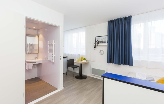 Logements meublés et équipés du studio au T2 comprenant : un coin nuit avec lit et couette, bureau et chaise, table de repas avec tabouret, de nombreux rangements, kitchenette équipée de plaque vitrocéramique, frigo, four à micro-ondes. Kit vaisselle et kit ménage.