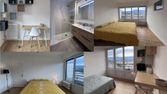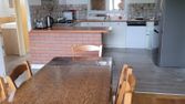 - 1 pièce (chambre) + cuisine équipée (évier deux bacs, mini-frigo, plaque de cuisson deux feux vitrocéramique, four à micro-ondes, lave-linge à hublot) + petite salle de bains avec douche, W.-C., lavabo sur colonne et glace murale,