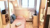 La pièce principale contient un lit, un grand bureau, une petite table, une kitchenette.