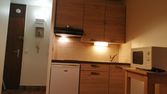 Cet appartement est composé d'une cuisine semi-équipée ouverte sur le séjour et d'une la salle de bain avec une douche.