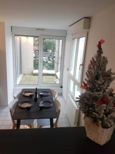 Chambre 12m2, plein sud, calme, grandes fenêtre, loggia privée +4m2 avec moquette gazon, grands rideaux, parquet, lit une personne ...