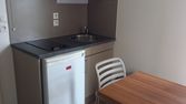 Duplex comprenant pièce à vivre avec coin cuisine (plan de travail, plaque de cuisson , réfrigérateur et placard)