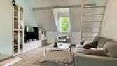 Grand 2 pièces a louer meublé cuisine équipée séparée salon avec petit balcon toilette séparée grande chambre superbe appartement au 4ieme étage sans ascenseur immeuble très propre et sécurisé locale vélo et poussette cour extérieur très cosy.