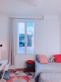 la superficie de cette chambre est de 12m², vue dégagée, sans vis à vis, lumunieuse, la présence d'un bureau, d'une TV, d'un ...