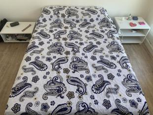 chambre 12 mètres carré, lit double, coussin, couverture, armoire, étagère, petit bureau, chaise, chauffe eau....