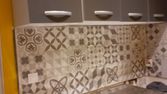 Salle de bain entièrement carrelée avec baignoire, meuble double-vasque, armoire de toilette miroir de 120cm et meubles de rangement.