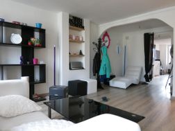 Un grand salon avec une cuisine américaine, une pièce ouverte sur le salon, une chambre, une salle de bain, un WC séparé. Un grenier.