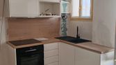deux chambres, dont une avec une baignoire d'angle, un toilette séparé. À l'étage, une troisième chambre avec une salle de douche et un toilette, un séjour et salle à manger avec cheminée. Cuisine américaine. Terrasse avec jardin de 60 m². Double vitrage, climatisation réversible, domotique. Grand garage avec mezzanines. Un cagibi. Emplacement aux abords du village, proche des commodités (bus, écoles, commerces, nature,…)