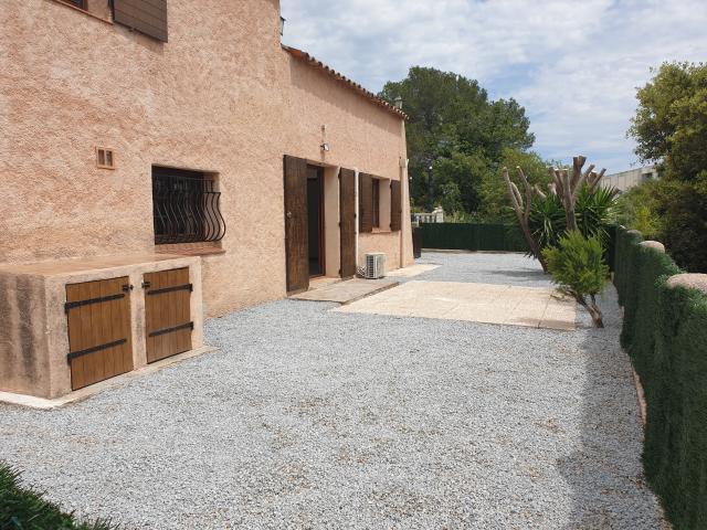 Rez de chaussée de villa, grande terrasse, parking privé, salle d'eau rénovée, vue sur la colline, au calme, eau chaude et froide dans les charges, électricité décompteur électrique, cuisine équipée, ...