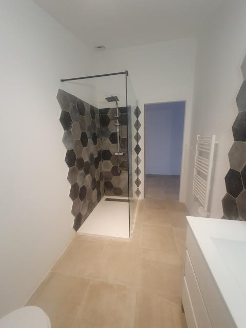 F2 RDJ de villa à louer vide à l'année dans lotissement sécurisé Le Val d'Aspé - 49 Imp du Ponant à ST-RAPHAEL - cuisine aménagée (meubles + hotte) - SDB avec douche, meuble vasque, sèche serviettes ...