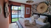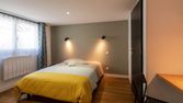 Chambre : Lit 140 - 2 chevets - bureau - 2 chaises - armoire - réfrigérateur - micro-onde - petite table d'appoint -