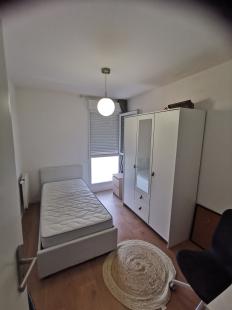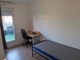 La chambre à louer (10m²) dispose d'un bureau et d'un lit simple. De nombreux rangements sont disponibles (tiroirs et placard dans ...